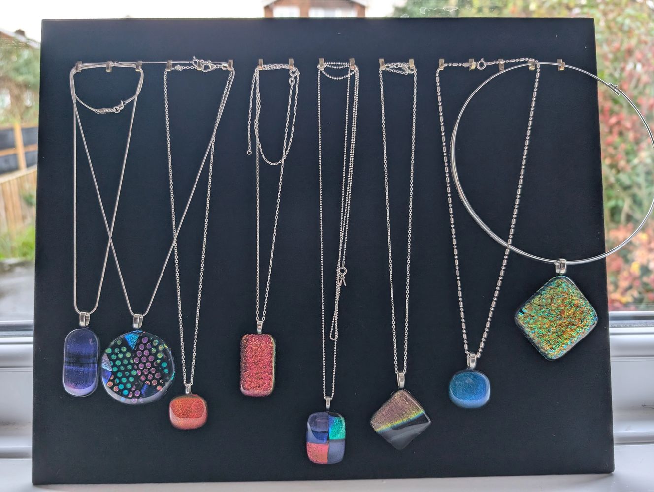 I make all kinds of jewellery, the necklaces are very popular as gifts. I also have stud or dangly earrings, cufflinks, brooches, hairpins amongst other items.